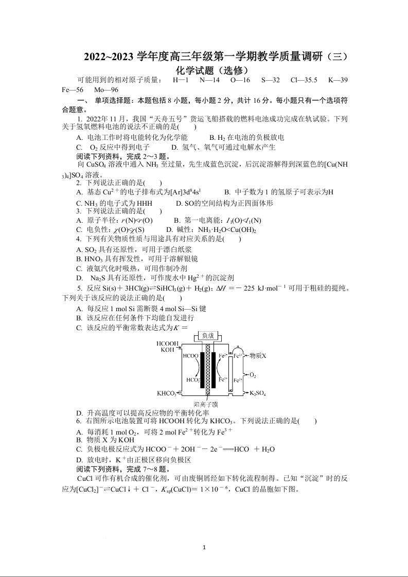 高三化学+答案--江苏省南通市如皋市2022-2023学年高三上学期教学质量调研(三)