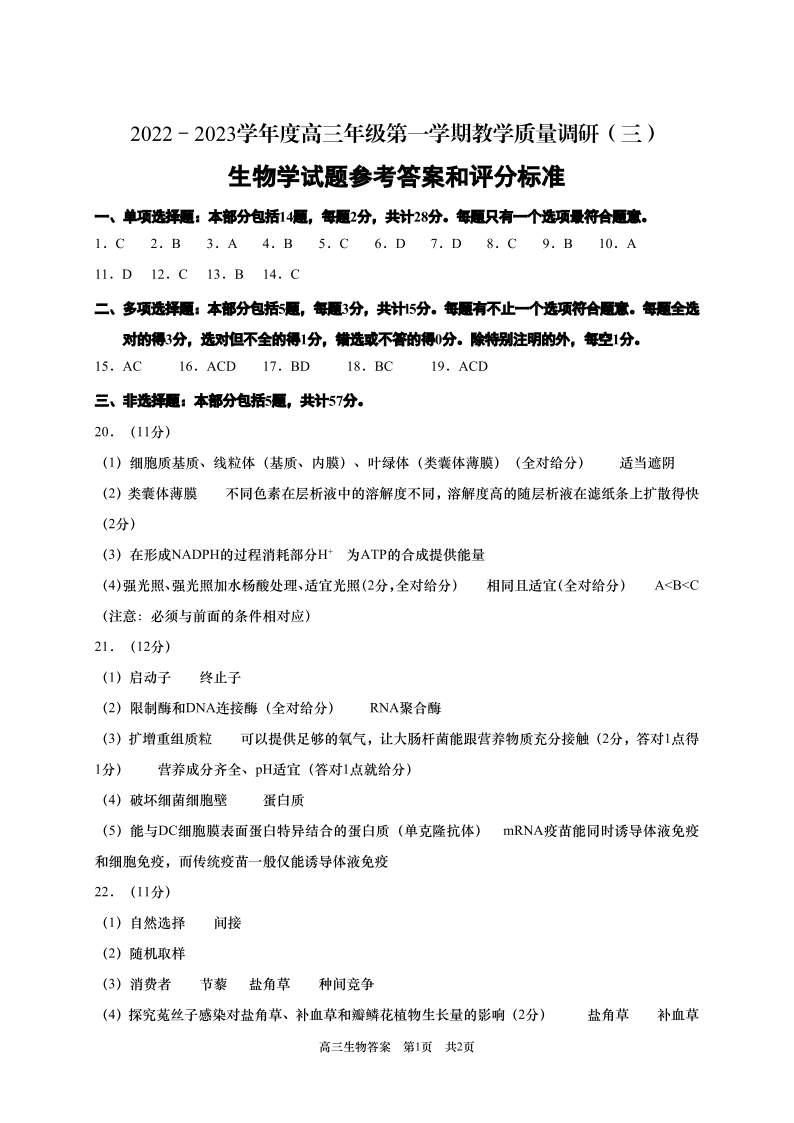 高三生物答案--江苏省南通市如皋市2022-2023学年高三上学期教学质量调研(三)