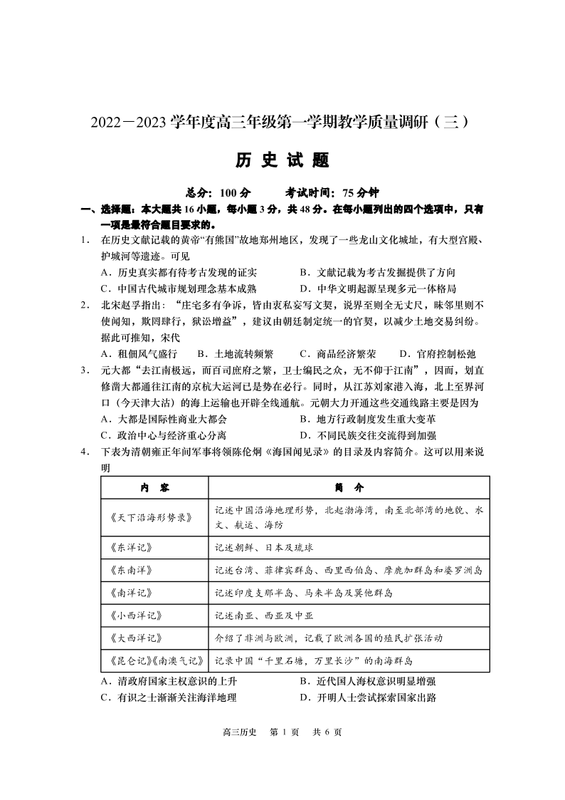 高三历史--江苏省南通市如皋市2022-2023学年高三上学期教学质量调研(三)