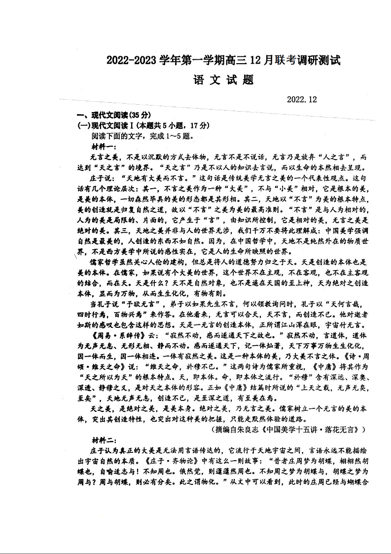 高三语文+答案--江苏省南通市高三2023届上学期12月调研测试