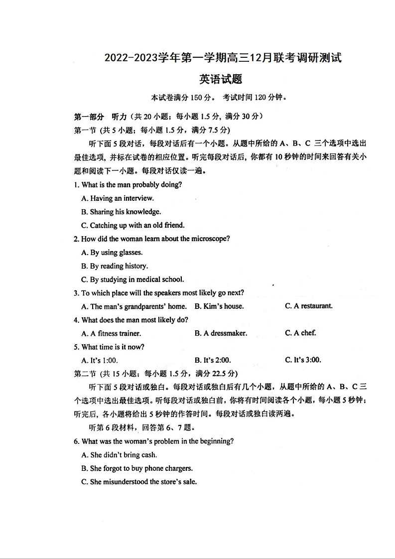 高三英语+答案--江苏省南通市高三2023届上学期12月调研测试