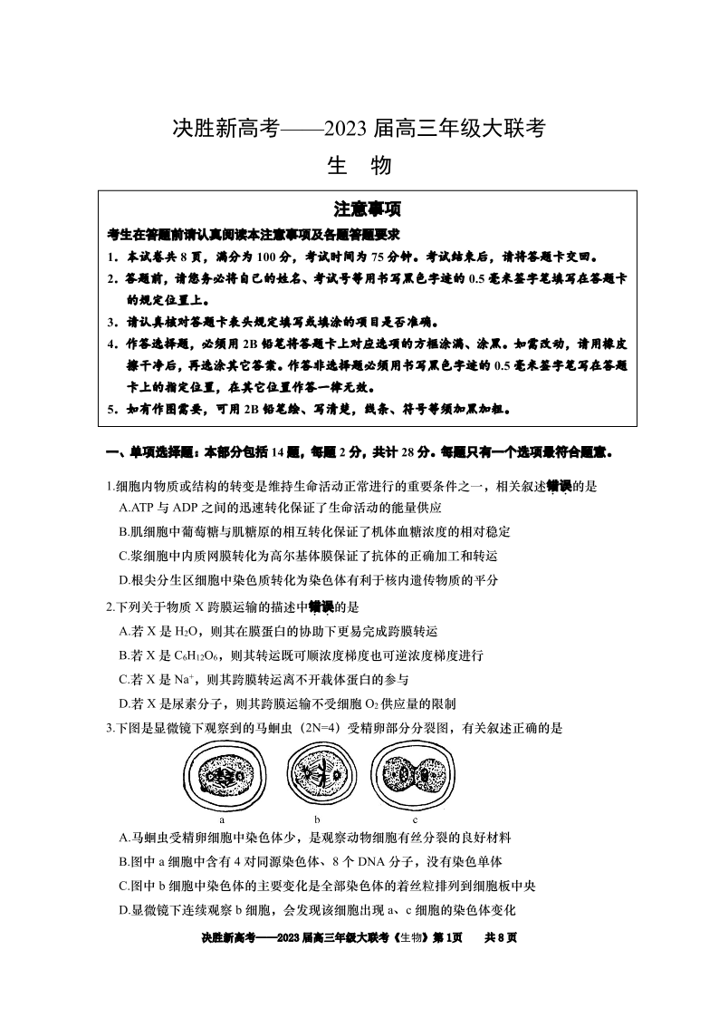高三生物--江苏省决胜新高考2023届高三上学期12月第四次大联考