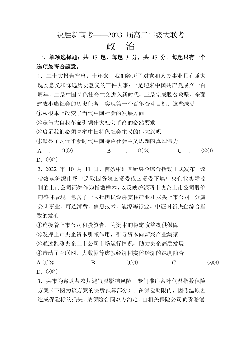 高三政治+答案--江苏省决胜新高考2023届高三上学期12月第四次大联考