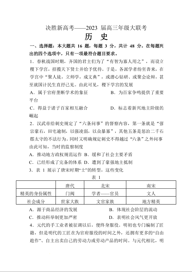 高三历史+答案--江苏省决胜新高考2023届高三上学期12月第四次大联考