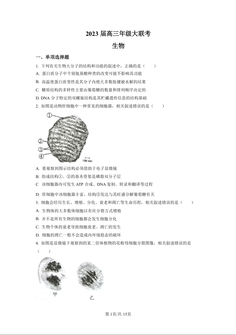 高三生物+答案--江苏省2023届高三上学期大联考