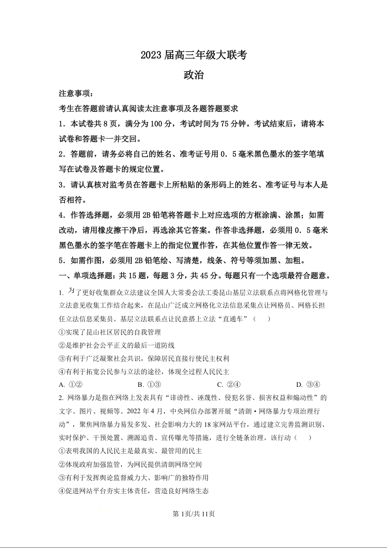 高三政治+答案--江苏省2023届高三上学期大联考