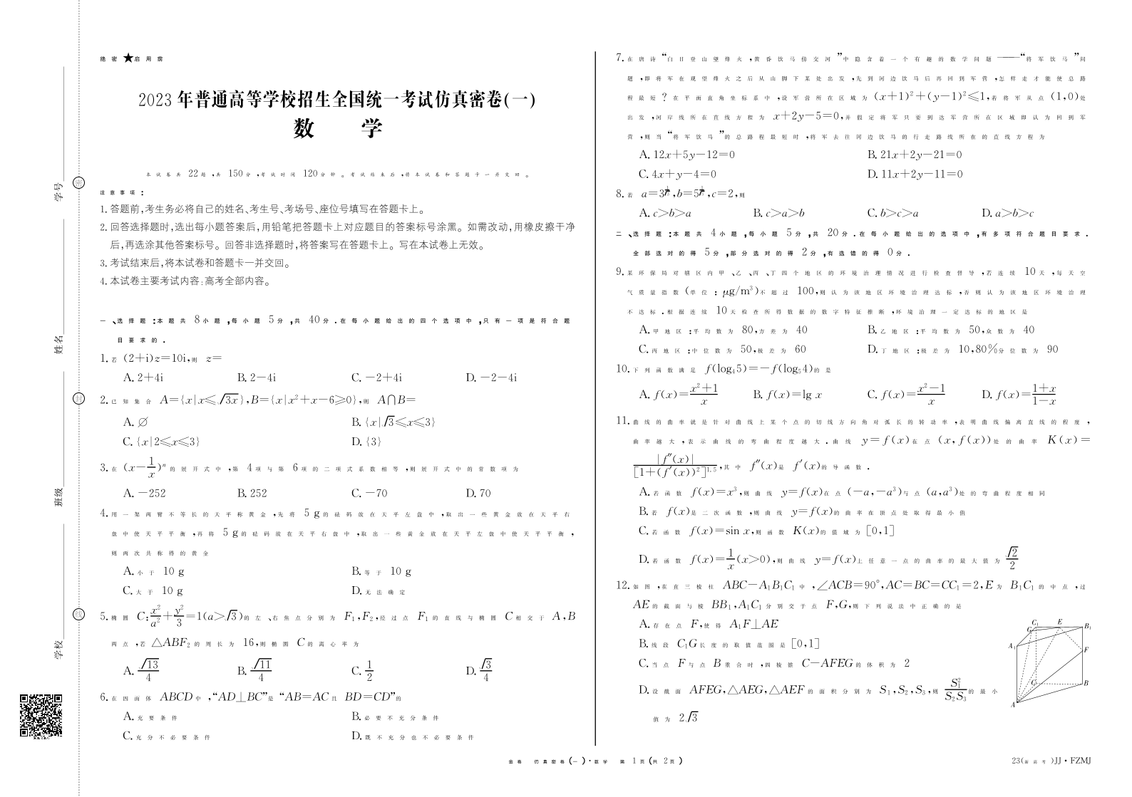 高三数学--湖南省普通高中2023年学业水平选择性考试仿真密卷(一)(新教材新高考)