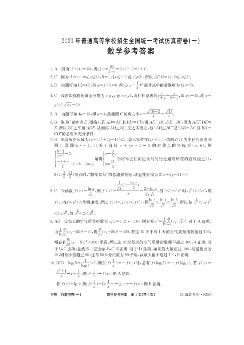 高三数学答案--湖南省普通高中2023年学业水平选择性考试仿真密卷(一)(新教材新高考)