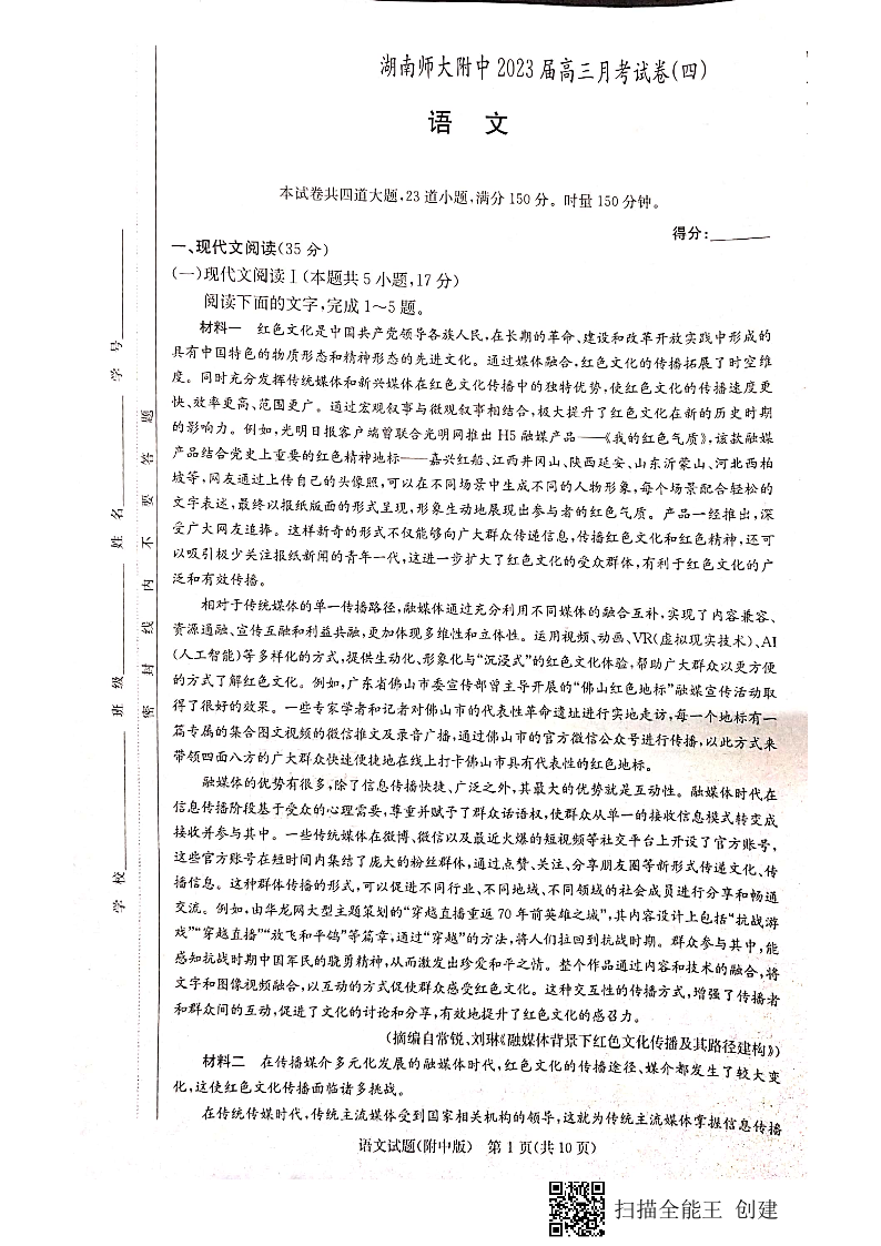高三语文-湖南师范大学附属中学2022-2023学年高三上学期月考卷(四)
