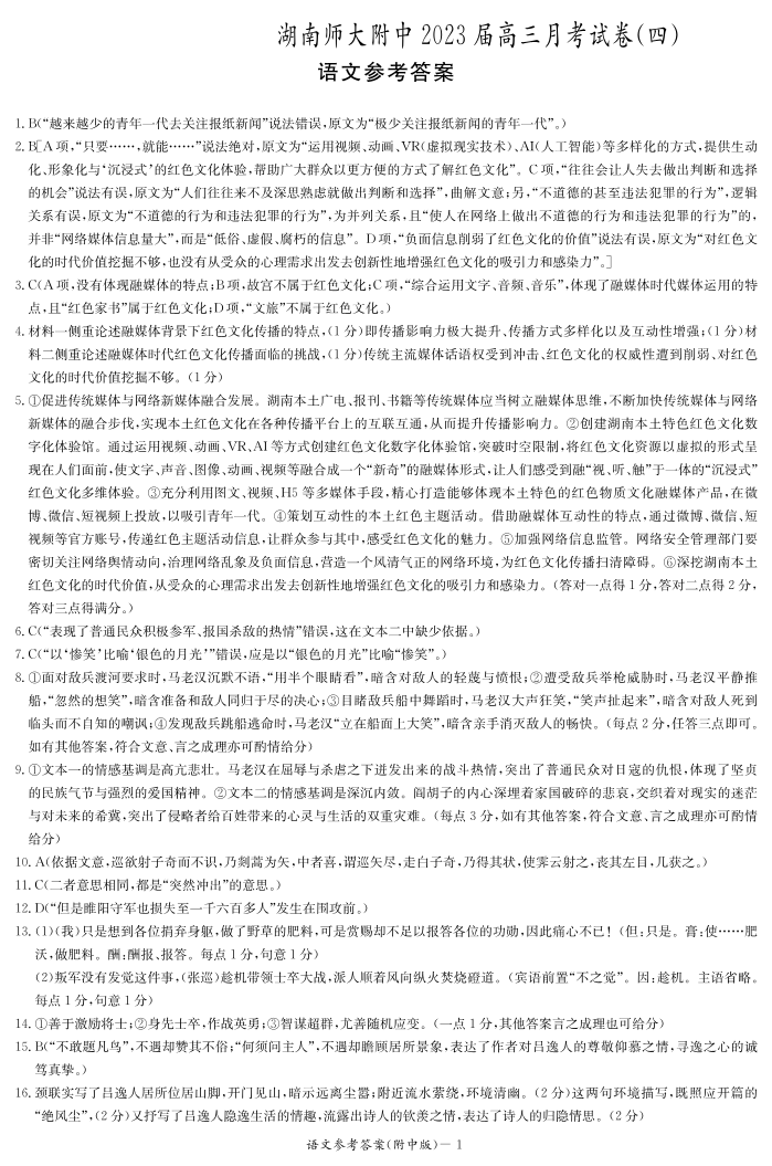 高三语文答案-湖南师范大学附属中学2022-2023学年高三上学期月考卷(四)