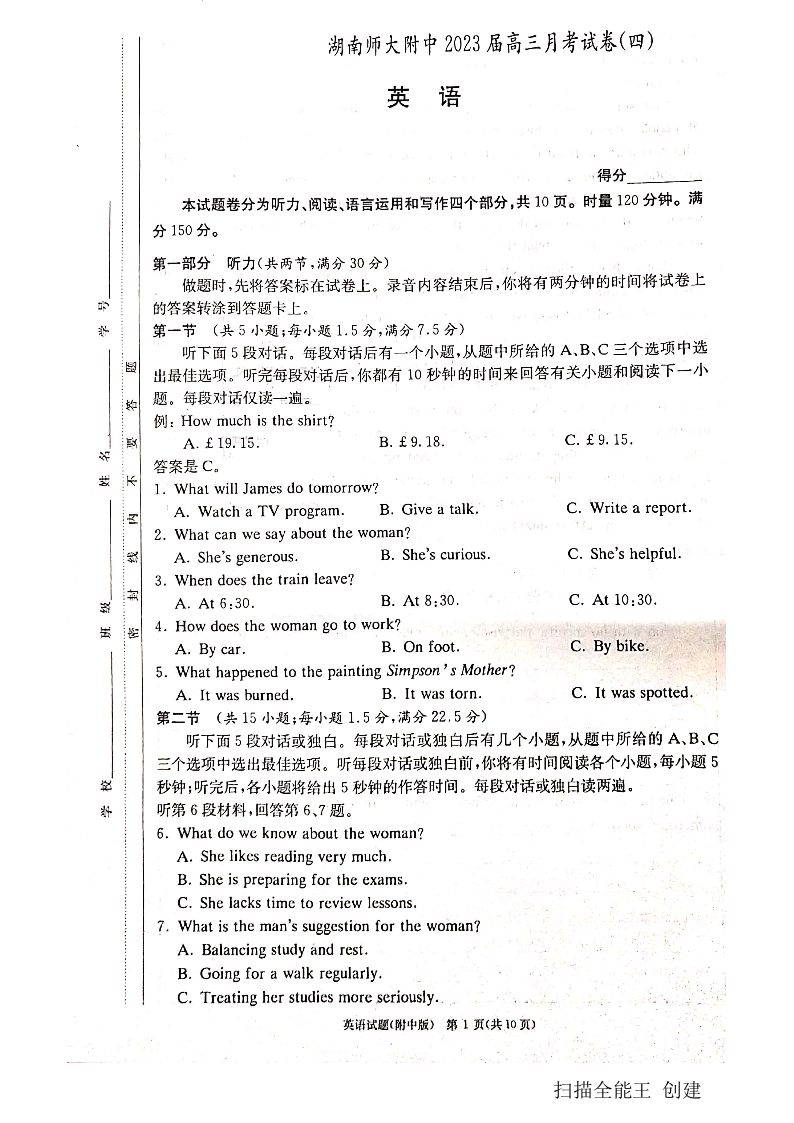 高三英语-湖南师范大学附属中学2022-2023学年高三上学期月考卷(四)