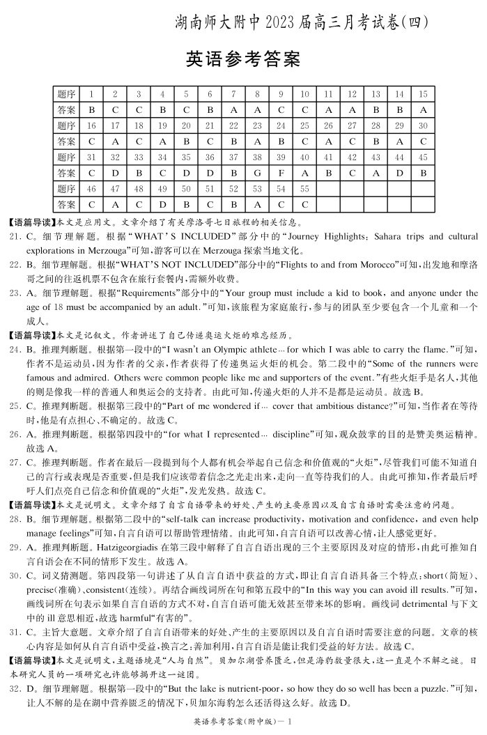 高三英语答案-湖南师范大学附属中学2022-2023学年高三上学期月考卷(四)