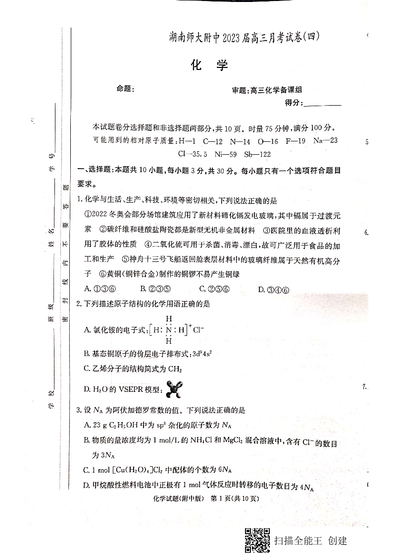 高三化学-湖南师范大学附属中学2022-2023学年高三上学期月考卷(四)