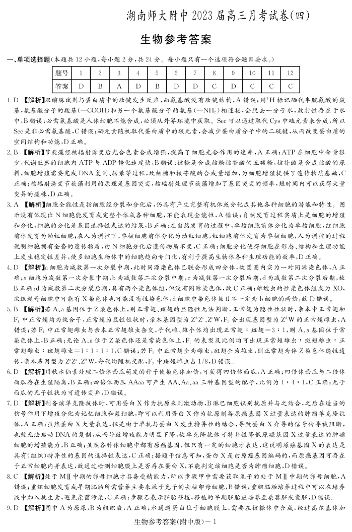 高三生物答案-湖南师范大学附属中学2022-2023学年高三上学期月考卷(四)
