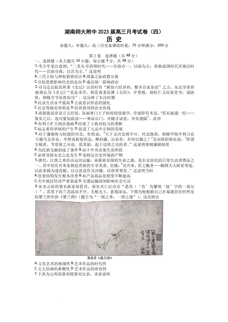 高三历史+答案-湖南师范大学附属中学2022-2023学年高三上学期月考卷(四)
