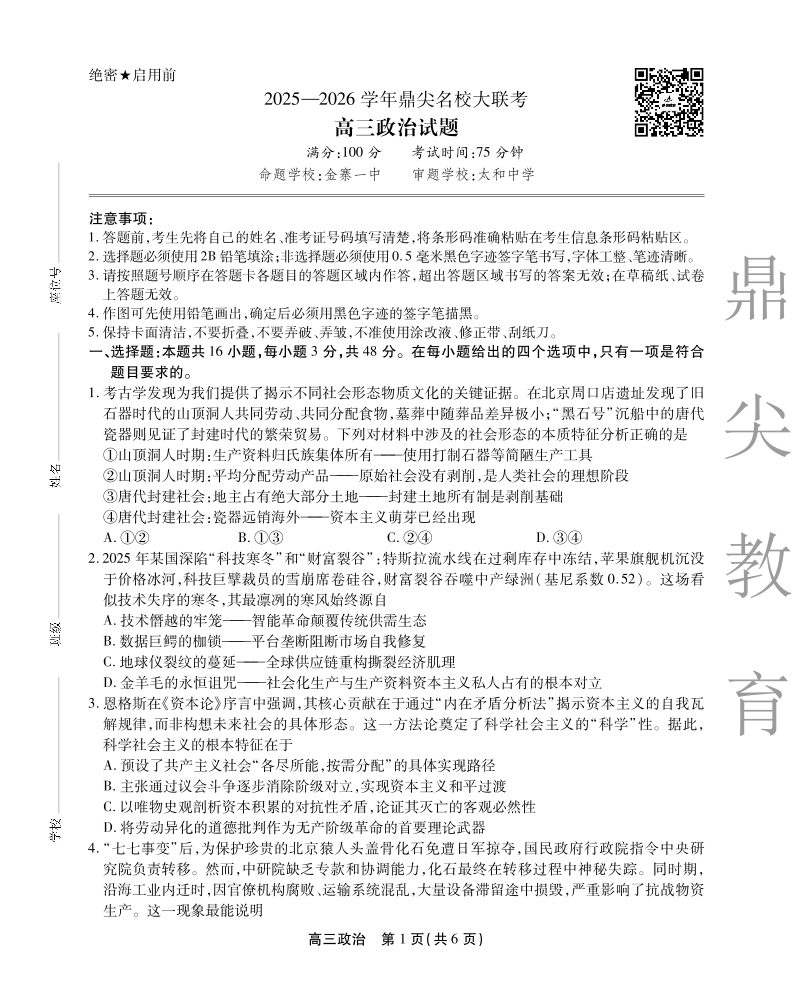高三政治--安徽省鼎尖名校大联考2026届高三上学期10月月考