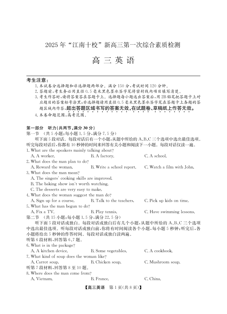 高三英语--安徽省江南十校2026届高三第一次综合素质检测