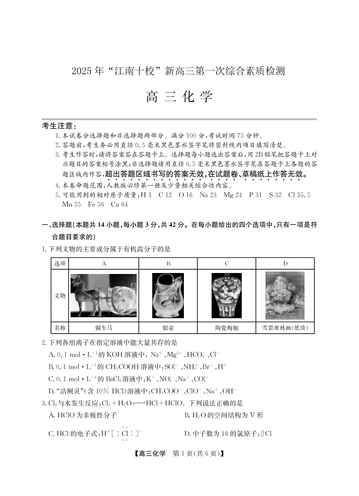 高三化学--安徽省江南十校2026届高三第一次综合素质检测