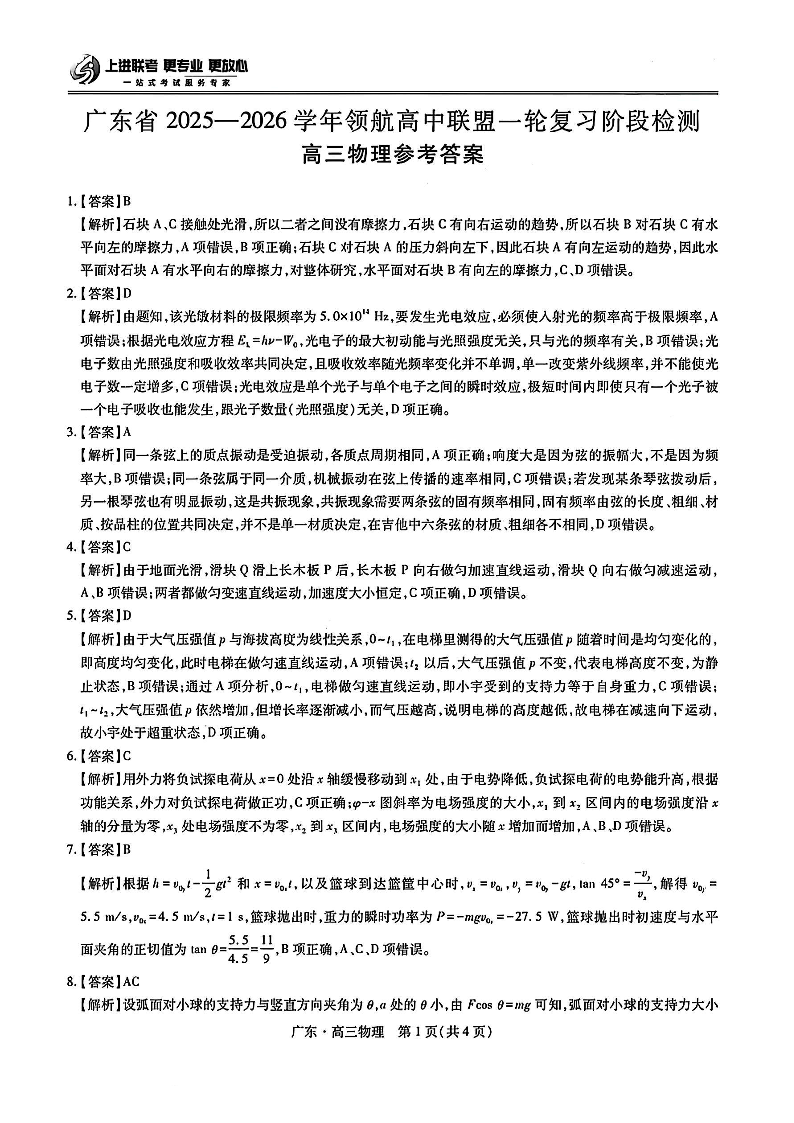 高三物理答案--广东省上进联考领航高中联盟2026届高三10月一轮复习阶段检测