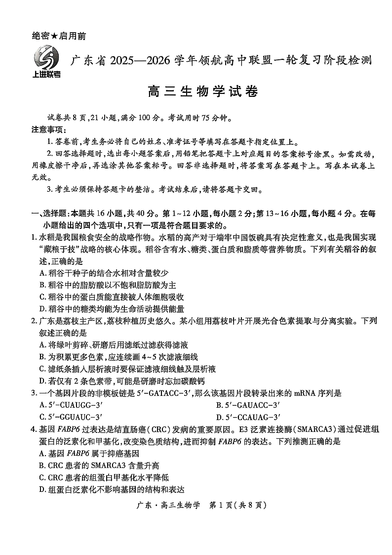 高三生物--广东省上进联考领航高中联盟2026届高三10月一轮复习阶段检测