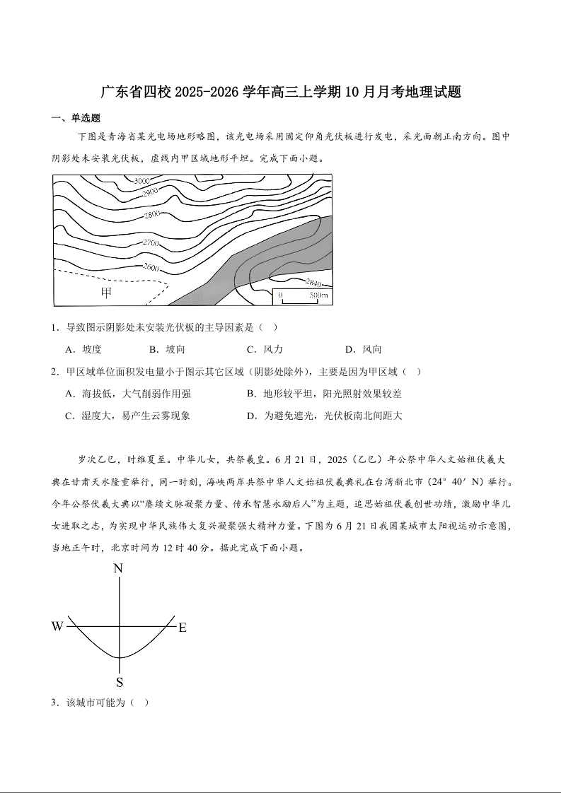 高三地理+答案--广东省四校2026届高三上学期10月教学质量检测
