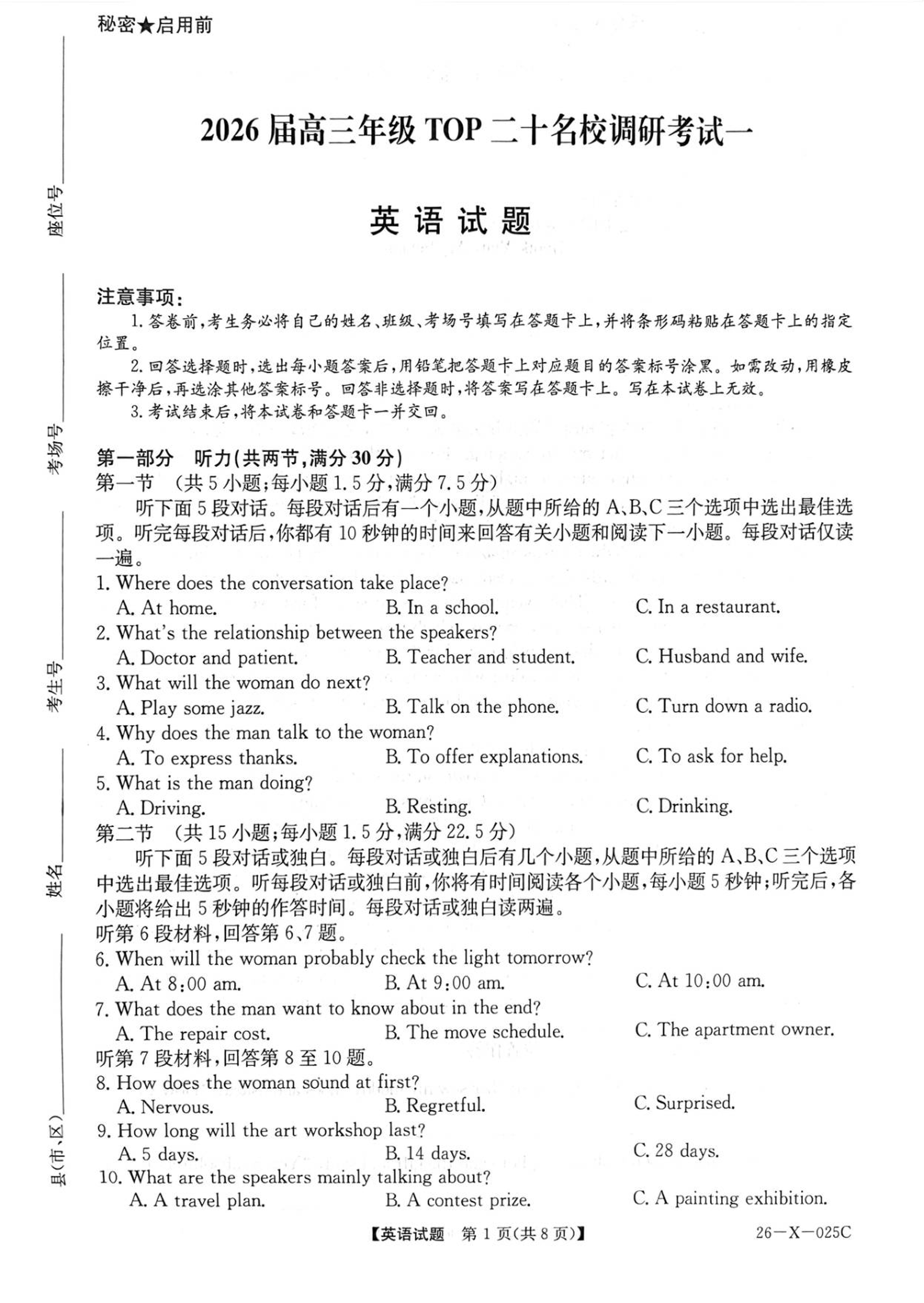 高三英语--河南省TOP二十名校2026届高三上学期调研考试(一)