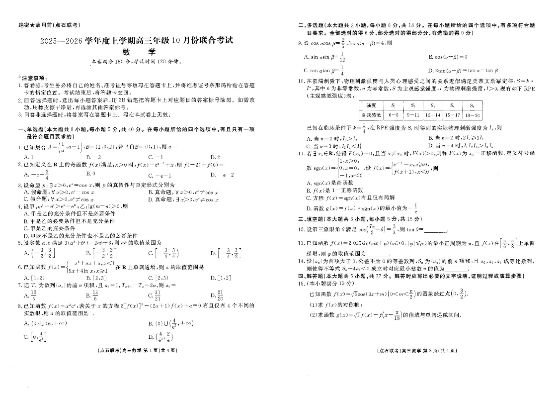 高三数学+答案--辽宁省普通高中点石联考2026届高三上学期10月月考