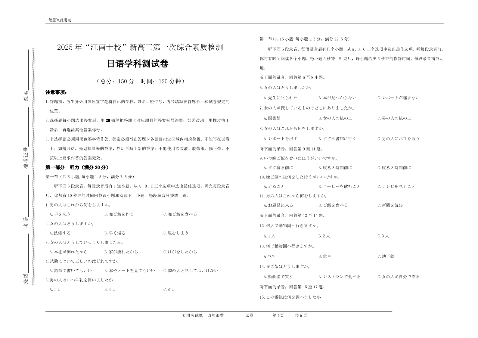 高三日语--安徽省江南十校2026届高三第一次综合素质检测