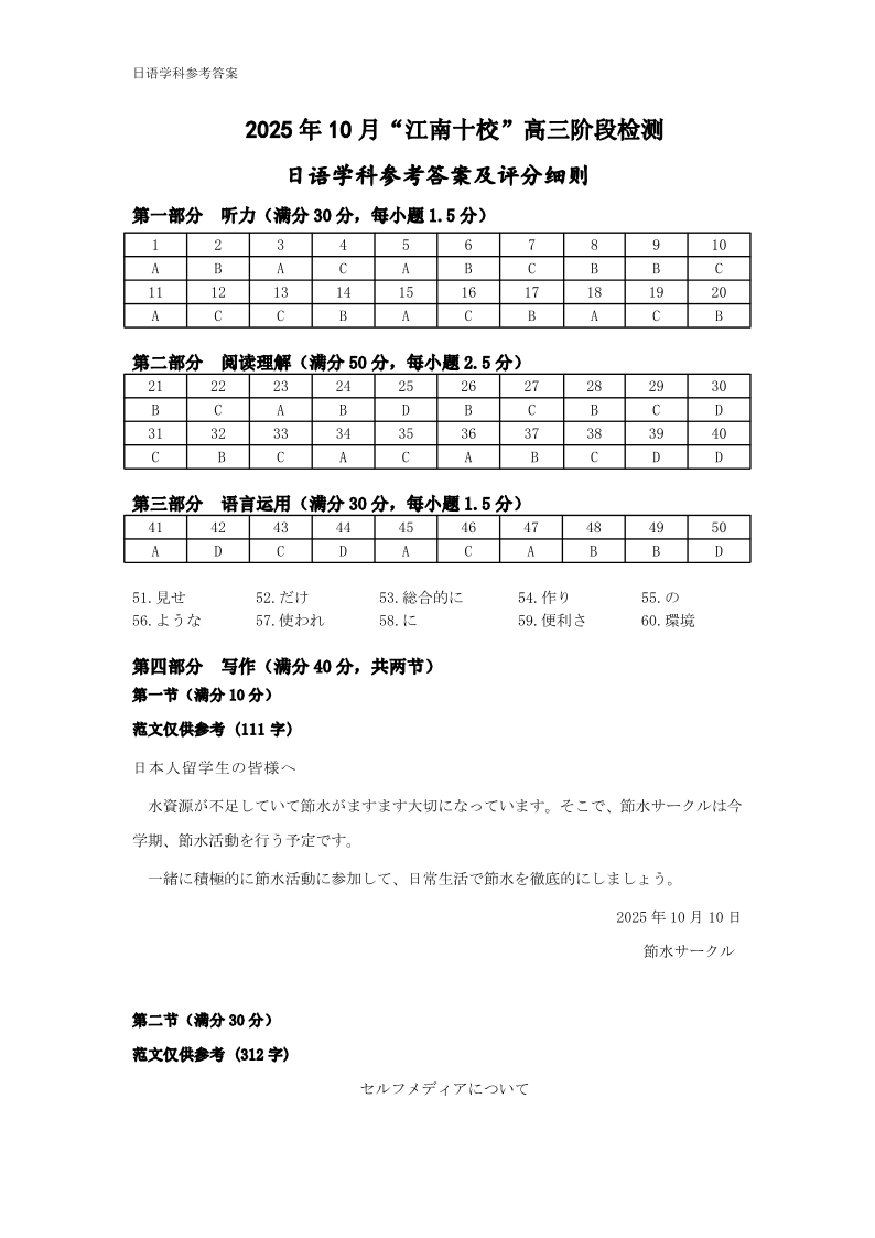 高三日语答案--安徽省江南十校2026届高三第一次综合素质检测