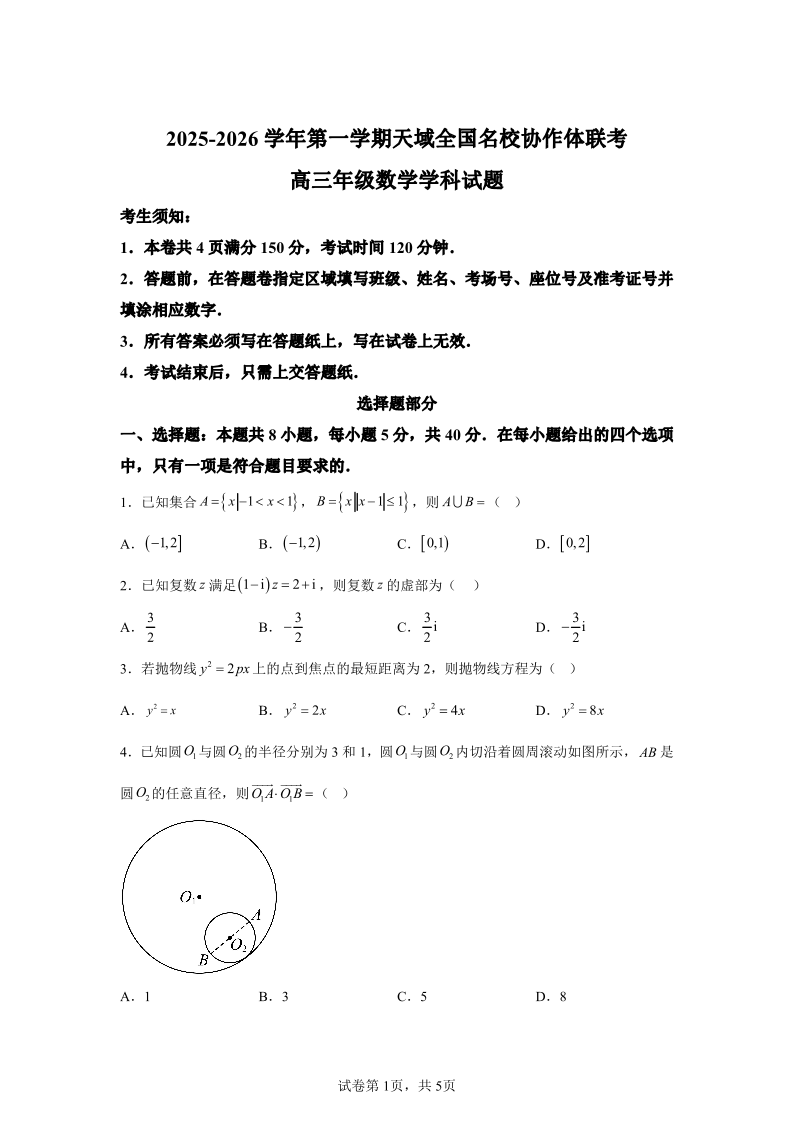 高三数学+答案--浙江省天域全国名校协作体2026届高三上学期10月联考