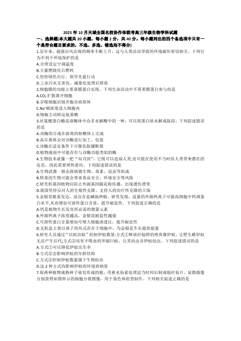 高三生物+答案--浙江省天域全国名校协作体2026届高三上学期10月联考