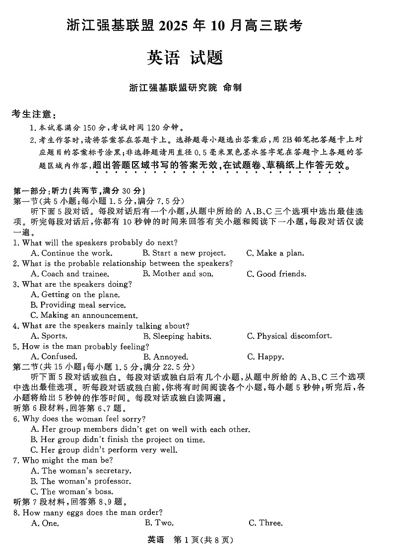高三英语--浙江省强基联盟2026j届高三上学期10月联考