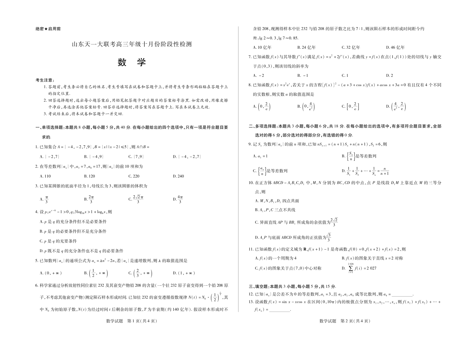 高三数学--山东省天一大联考2026届高三年级十月份阶段性检测