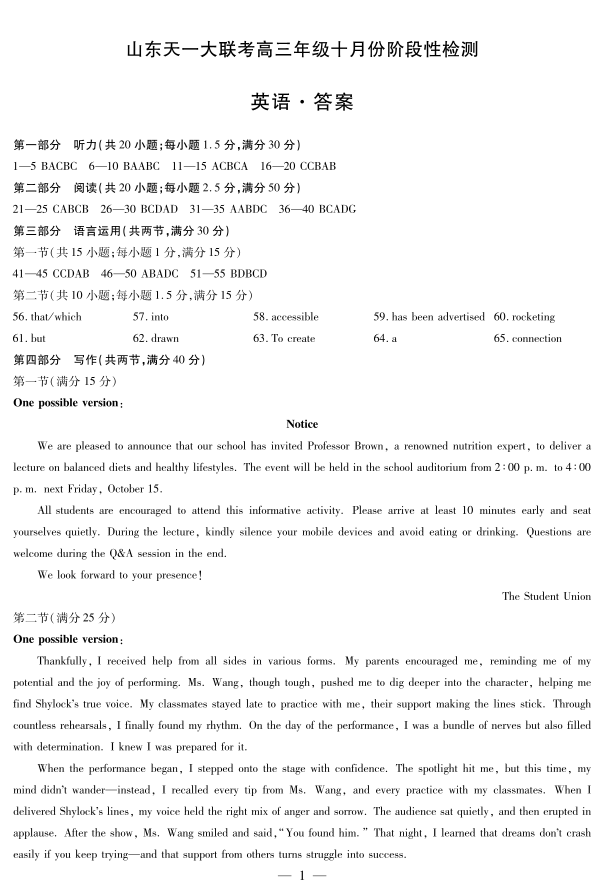 高三英语答案--山东省天一大联考2026届高三年级十月份阶段性检测