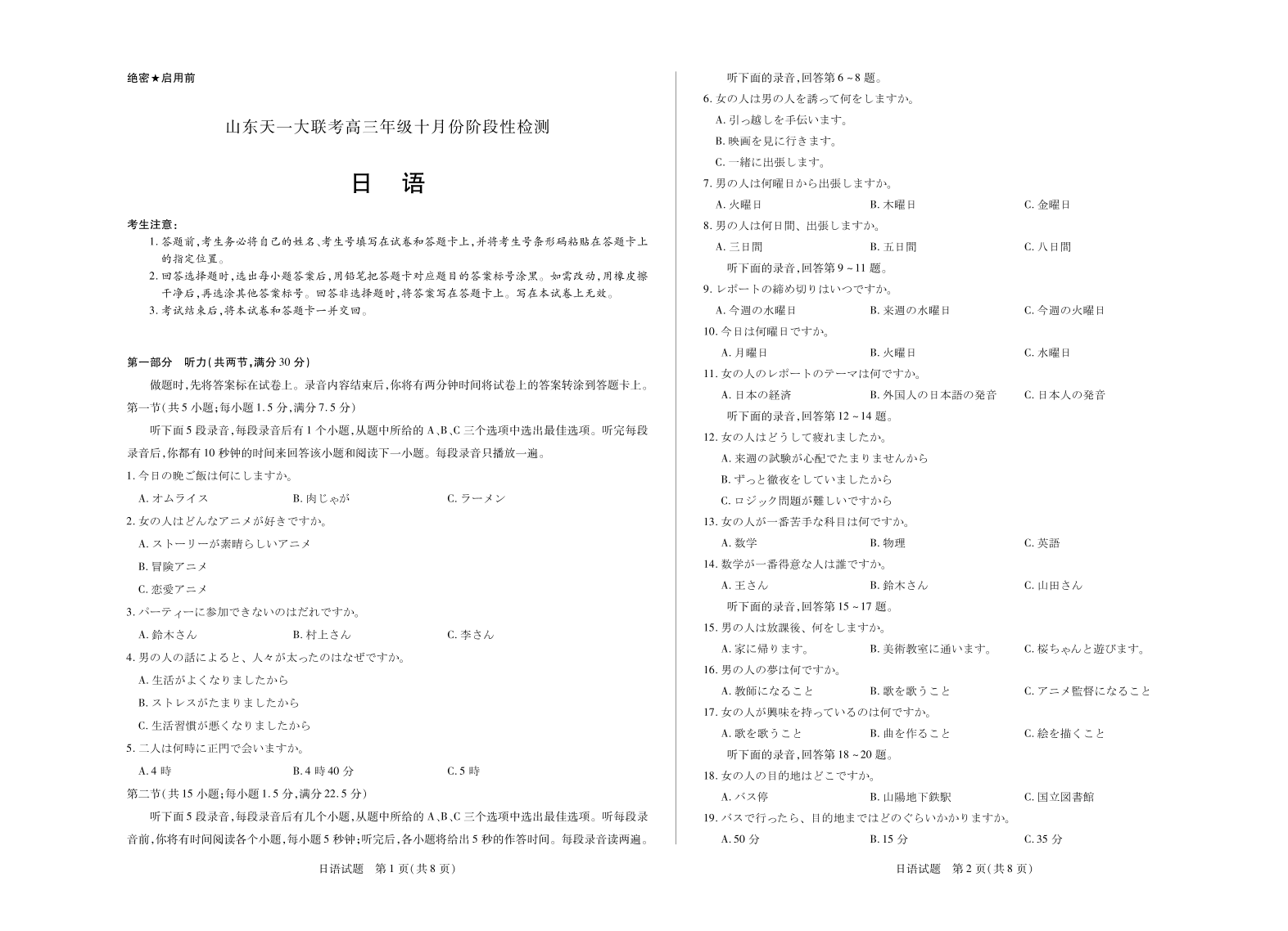 高三日语--山东省天一大联考2026届高三年级十月份阶段性检测