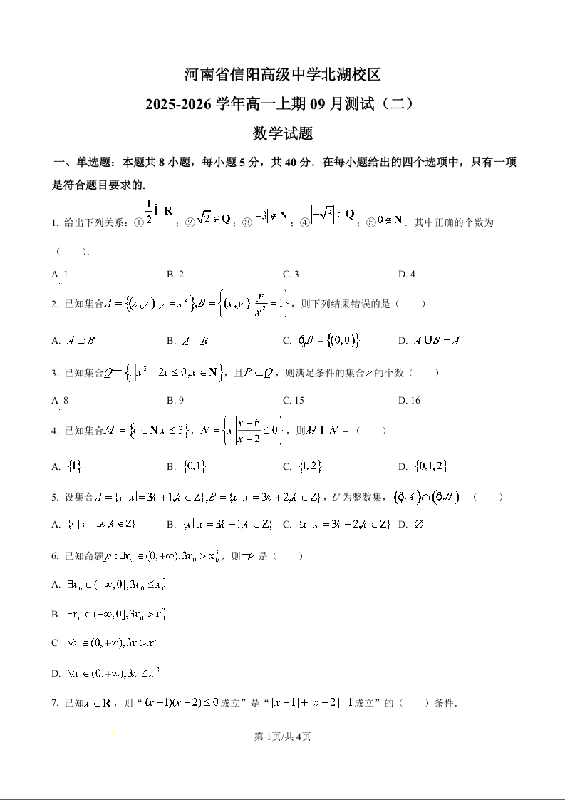 高一数学(原卷版)--河南省信阳市信阳高级中学2025-2026学年高一上学期9月测试(二)试题