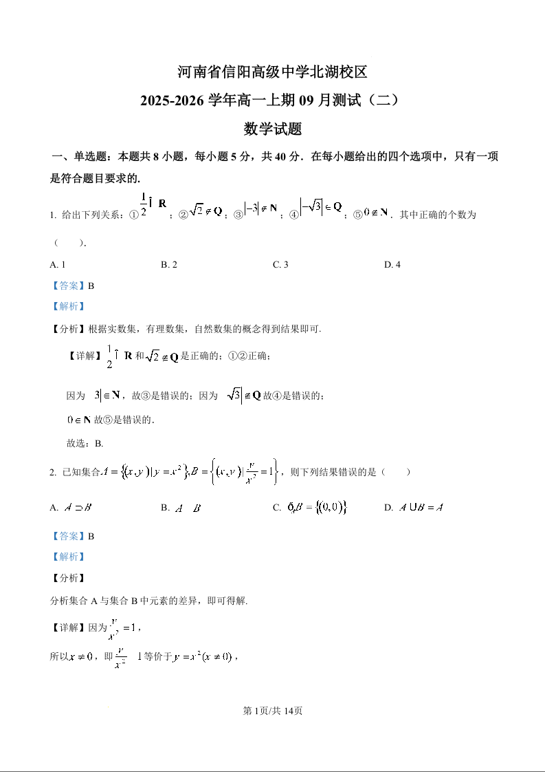 高一数学(精品解析版)--河南省信阳市信阳高级中学2025-2026学年高一上学期9月测试(二)试题