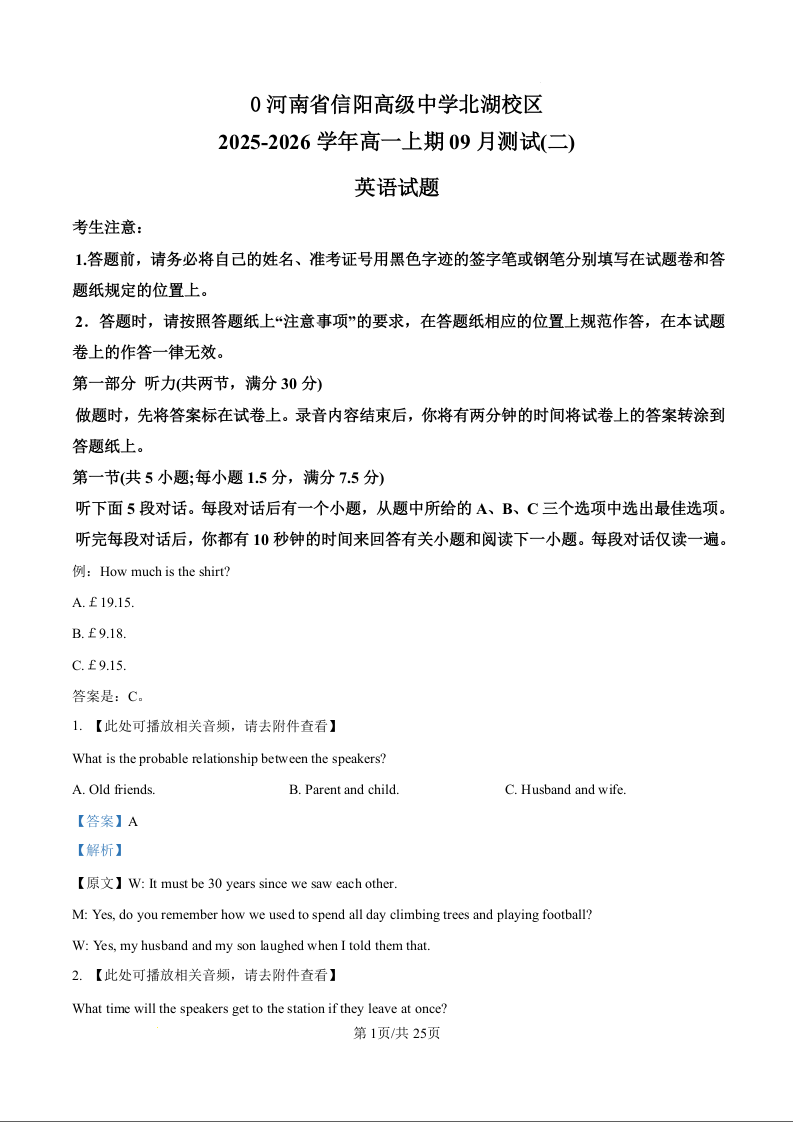 高一英语(精品解析版)--河南省信阳市信阳高级中学2025-2026学年高一上学期9月测试(二)试题