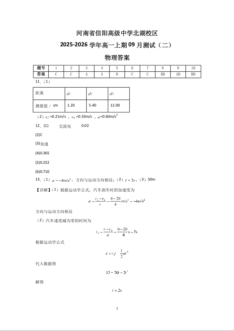 高一物理答案--河南省信阳市信阳高级中学2025-2026学年高一上学期9月测试(二)试题