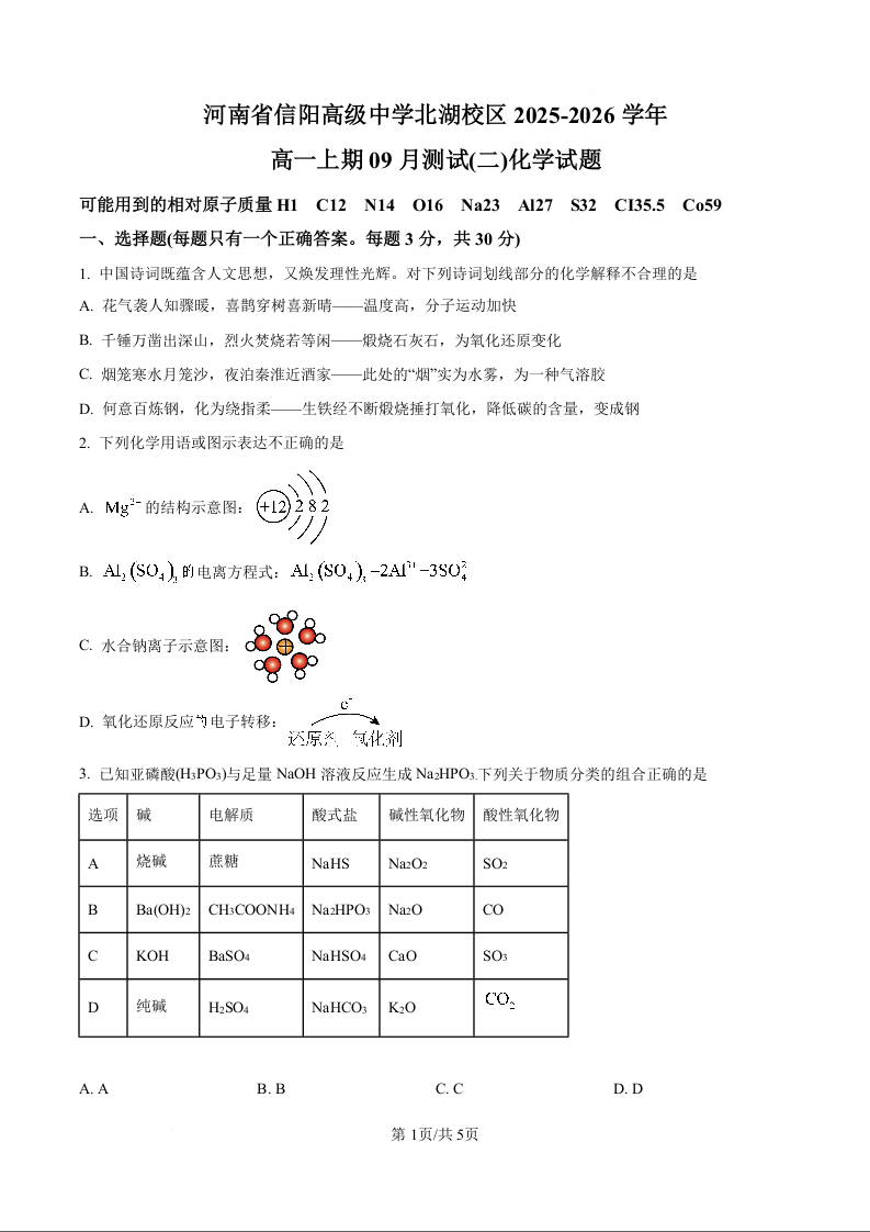 高一化学(原卷版)--河南省信阳市信阳高级中学2025-2026学年高一上学期9月测试(二)试题