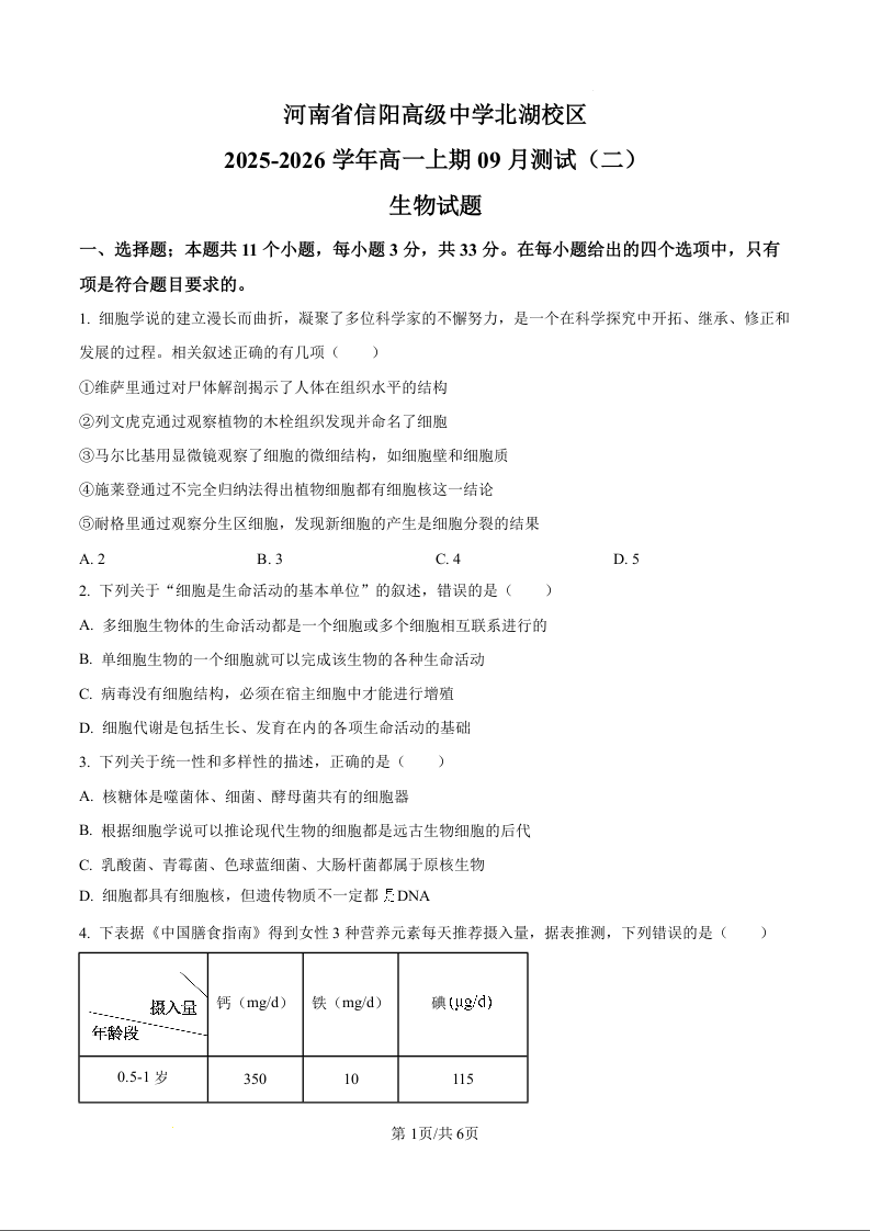 高一生物(原卷版)--河南省信阳市信阳高级中学2025-2026学年高一上学期9月测试(二)试题