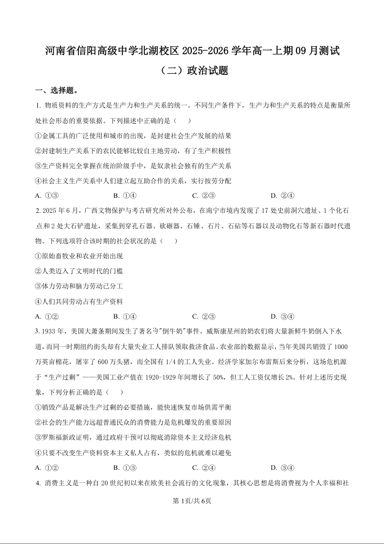 高一政治(原卷版)--河南省信阳市信阳高级中学2025-2026学年高一上学期9月测试(二)试题