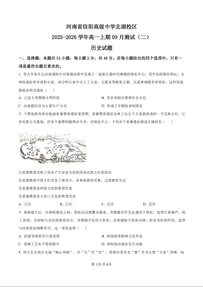 高一历史(原卷版)---河南省信阳市信阳高级中学2025-2026学年高一上学期9月测试(二)试题