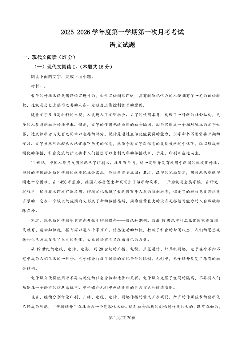 高一语文(精品解析版)--黑龙江省牡丹江市第二高级中学2025-2026学年高一上学期9月月考试题