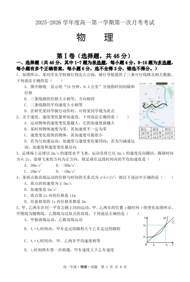 高一物理--黑龙江省牡丹江市第二高级中学2025-2026学年高一上学期9月月考试题
