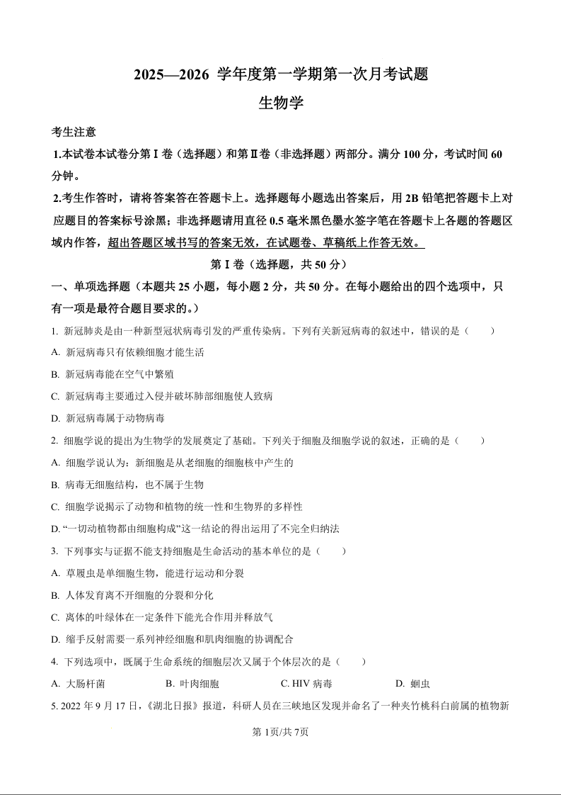 高一生物(原卷版)--黑龙江省牡丹江市第二高级中学2025-2026学年高一上学期9月月考试题