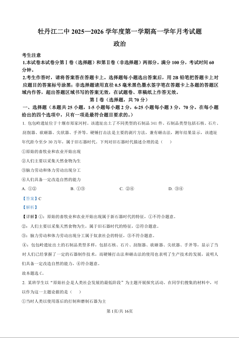 高一政治(精品解析版)--黑龙江省牡丹江市第二高级中学2025-2026学年高一上学期9月月考试题