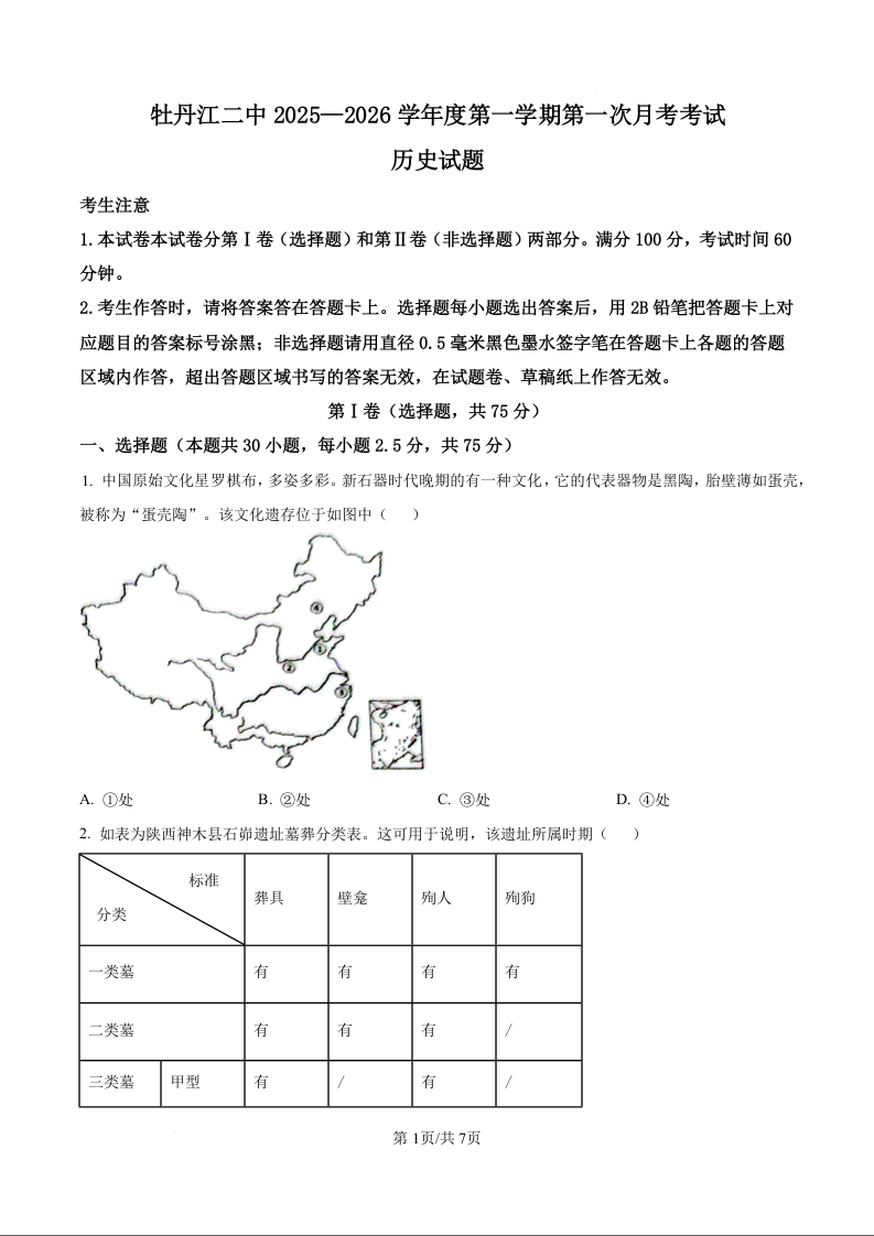高一历史(原卷版)--黑龙江省牡丹江市第二高级中学2025-2026学年高一上学期9月月考试题