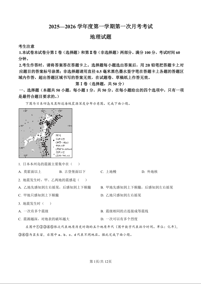 高一地理(原卷版)--黑龙江省牡丹江市第二高级中学2025-2026学年高一上学期9月月考试题