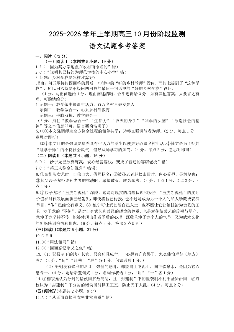 高三语文答案--潍坊部分区域2025.10高三阶段性统考